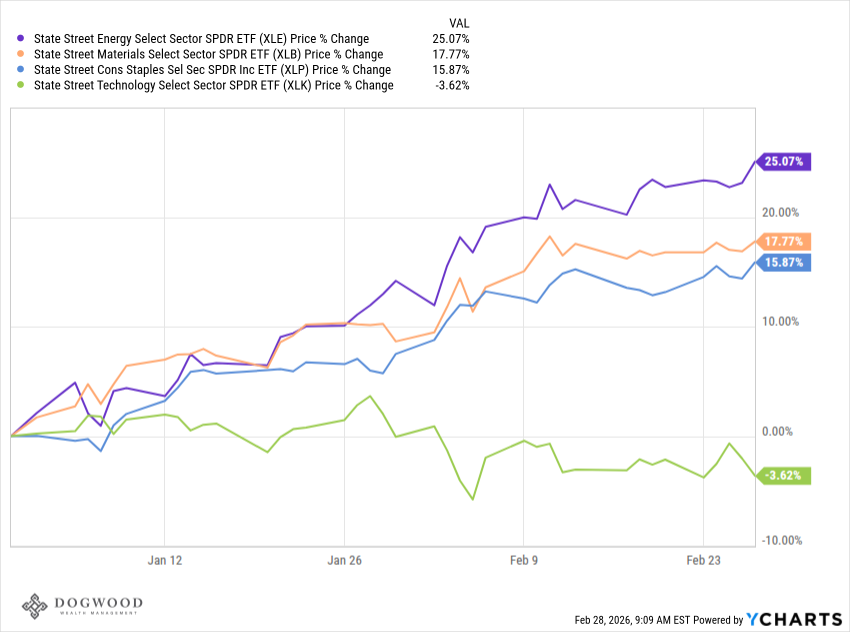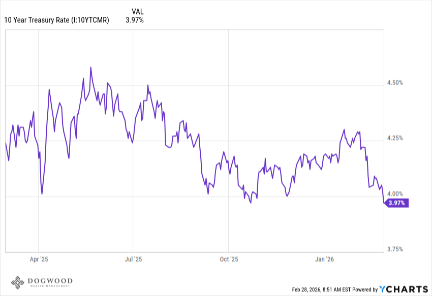 The S&P 500 saw a modest decline of 0.4% this week as we continue to see a rotation out of technology stocks and into other areas of the market like energy, materials, and consumer staples. On one hand, it's great to see a broadening out of stocks that are rising as the bull market has entered it's fourth year. On the other hand, tech stocks are arguably the reason for the strength of the bull market, and one has to wonder if the overall market can hold up (and for how long) with those stocks struggling to find traction. The S&P 500 is only about 1% from it's all-time high while tech stocks, which haven't sniffed all-time highs in over 4 months, find themselves down roughly 10%, firmly in correction territory. Interestingly, the Magnificent Seven companies reporting Q4 earnings growth of more than 27% while their stock prices have fallen.