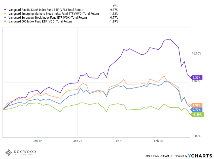 The S&P 500 fell by 2% this week as the market reacted to the beginning of what could be an extended conflict with Iran. Fears of AI taking over the software industry seamed to take a backseat to a oil price shock. The initial market decline was sharper overseas than it was in the US, perhaps because of the dependence of foreign nations on Middle East oil. Year-to-date gains were wiped away from both US and European stock markets this week. Despite how poor sentiment currently is with tepid job growth, sticky inflation, and war breaking out, the S&P 500 is only 3.5% off it's all-time high. With oil prices surging 35% in the last week, the market's decline of just 2% leaves us with the feeling that it could have been (perhaps should have been?) a lot worse.