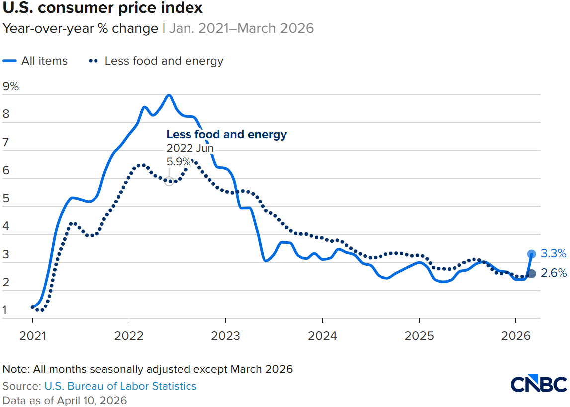 Inflation rose by 0.9% in the last month, according to the latest consumer price index report out Thursday. The jump was largely attributed to a 21% increase in gasoline prices, which accounted for about three quarters of the change. It might sound like putting lipstick on a pig, but removing food and energy prices, core inflation rose just 0.2% in March, which indicates a moderate change in inflation over the month. While we are now clearly seeing the impact of the Iran war and the oil spike on inflation, we've yet to see a material change in the employment numbers. Claims for unemployment insurance did rise to 219,000, up from 203,000 the week before, but remain relatively low, indicative of a stable labor market.