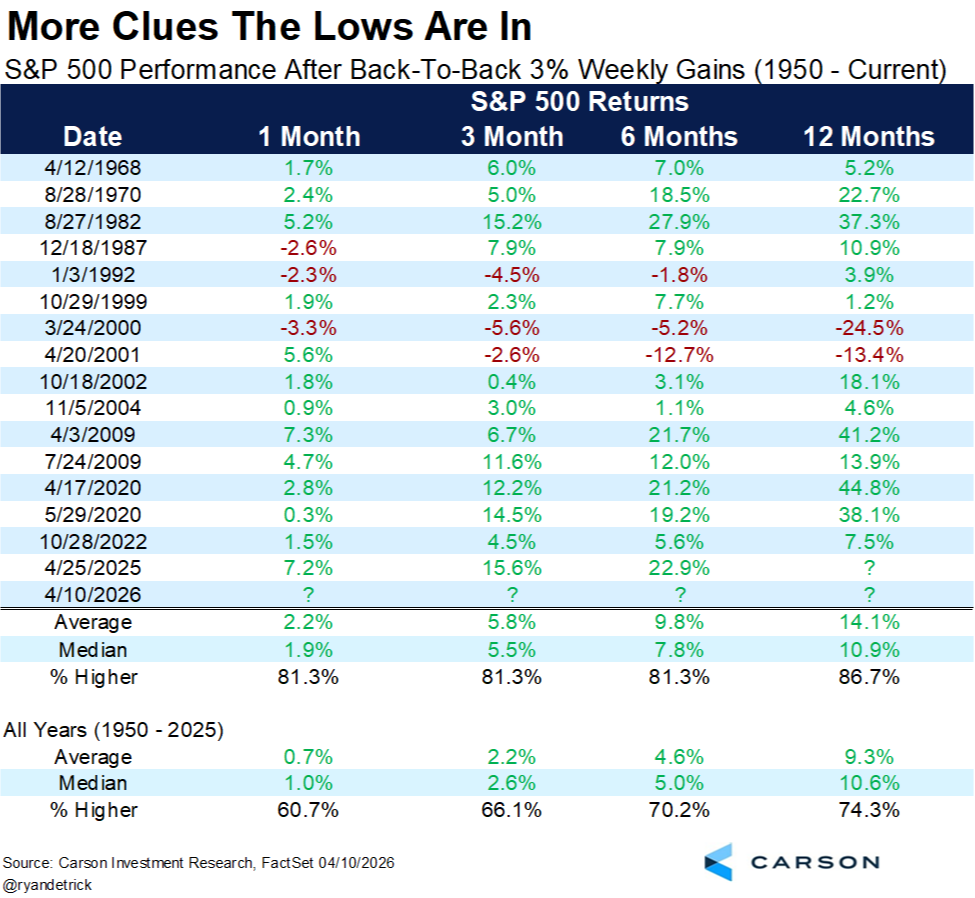 We now have back-to-back weeks where the market has risen by more than 3%. While not a guarantee that the bottom is in, the forward 12-month returns for the market after consecutive 3% weeks is above average, both in terms of win rate and cumulative gain, according to Ryan Detrick at Carson.